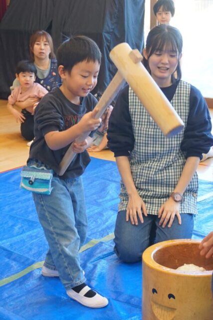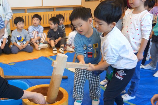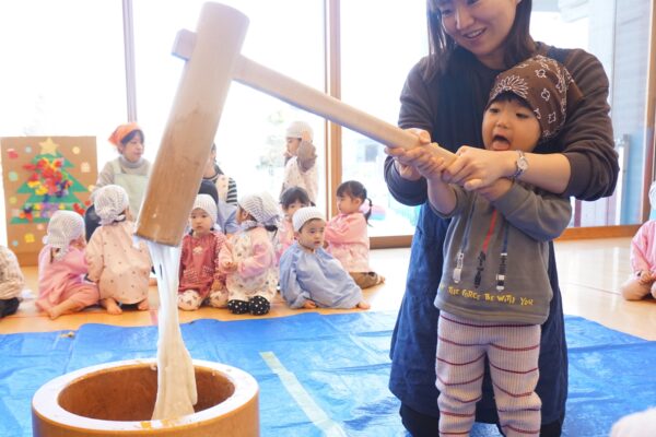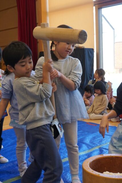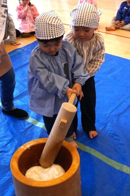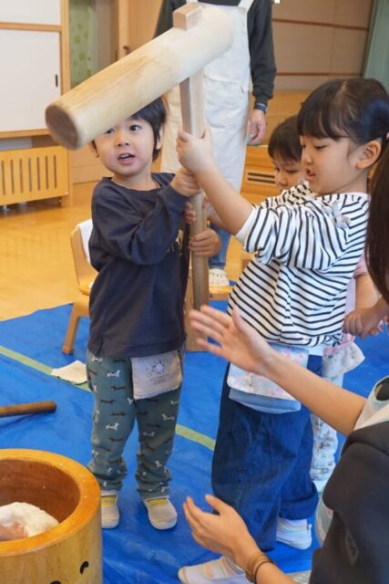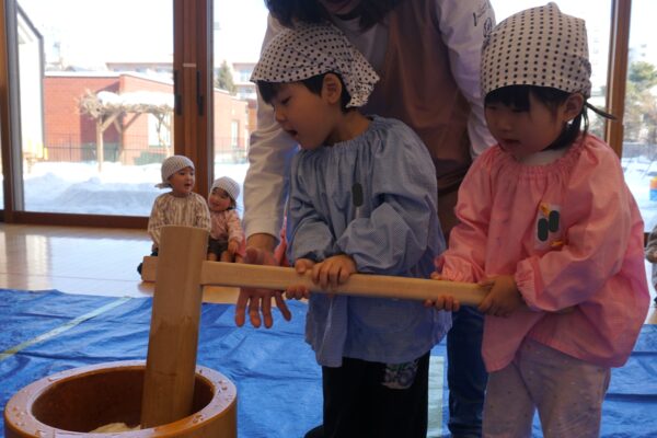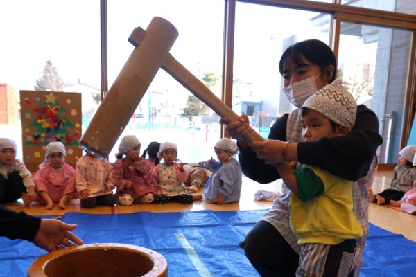 19日(金) おもちつき みんなでおもちつきの歌を歌って、ことりぐみさんからあおさんまで元気いっぱいにおもちをつきましたよ!