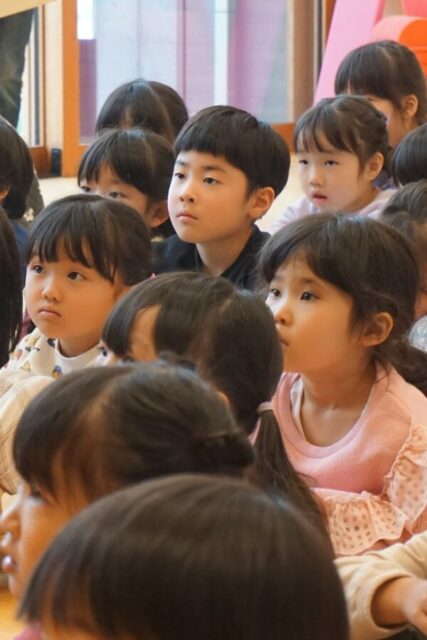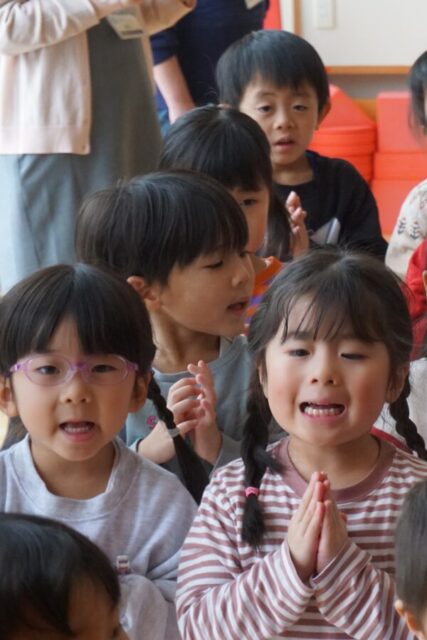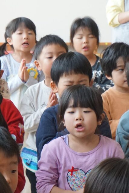 七五三のお祝い(10/9) 自分たちがこれまで元気に大きく育ってきたことをみんなでいっしょに喜び合い、神様や家族の愛に「ありがとう」の気持ちを持つことができました。