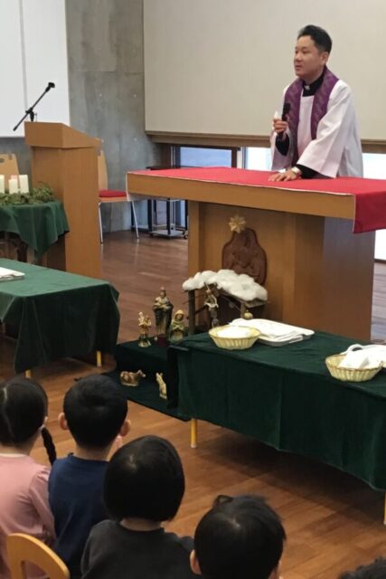待降節が始まりました! 11月17日(月) 神父様から、イエス様がお生まれになるまで『きれいな心』や『優しい心』で過ごすことが大切ですよと教えていただきました。みんな真剣な表情で聞き入り、自分は何ができるかなと考えました。