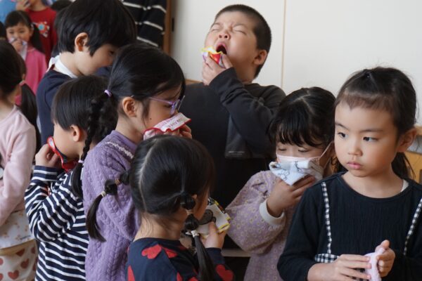 2月3日(火) 豆まき 今日は節分。安心安全なはずのこども園にも鬼が来てしまいました。みんなで勇気を振り絞って豆をまいたら、鬼はみんなの心の中のよくない鬼といっしょに逃げていってしまいました。めでたしめでたし!