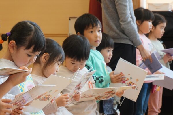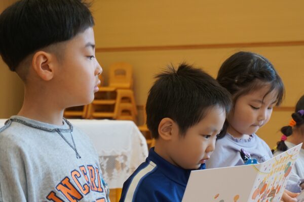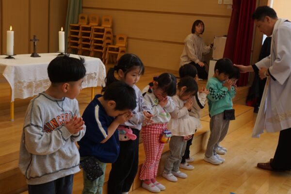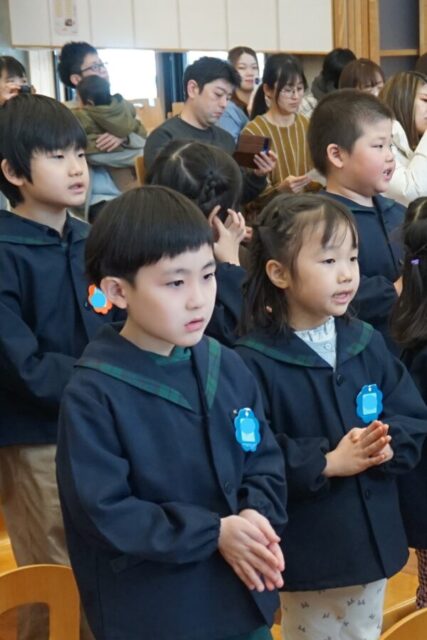 2月17日(火) 卒園感謝の集い 今日は、卒園する子どもたちの保護者の皆様にも来園していただき、これまで神さまに守られて成長できたこと、そして、たくさんのおめぐみをいただいたことに感謝する「卒園感謝の集い」を行いました。